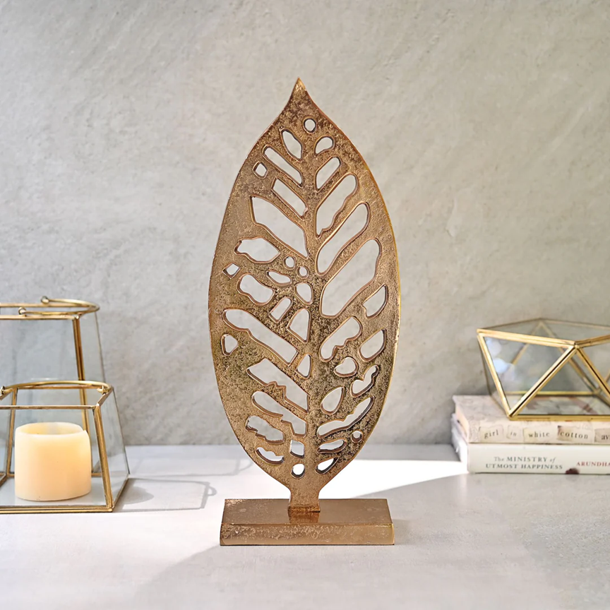 Large Gold Metal Filigree Leaf Sculpture; Intricate Botanical Design; Marble Base; available at wholesale prices.