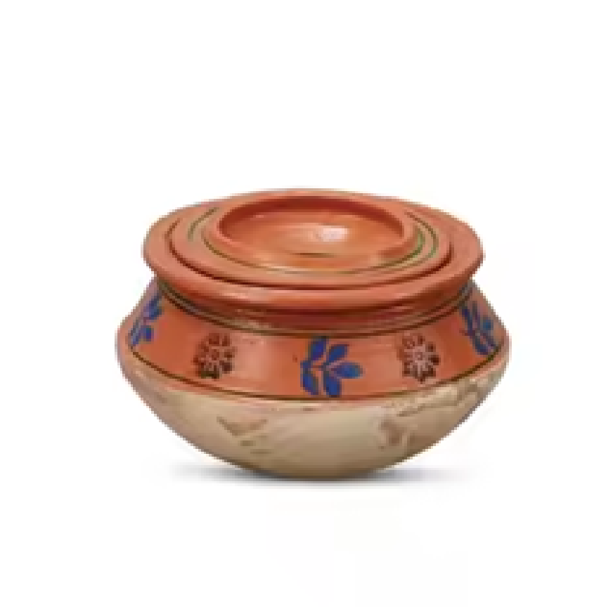 Large Hand-Painted Terracotta Clay Cooking Pot with Colorful Floral Design and Lid - Artistic Earthenware Pot for Home Cooking