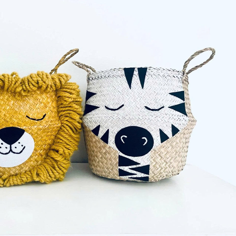 Large Handwoven Seagrass Basket with Zebra Face for Kids Room Belly Basket for Toy Storage, Laundry, or Nursery Decoration