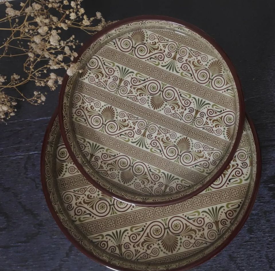 Large Iron Round Serving Tray with Palm Tree Enameled Print Used for Table Ware Home