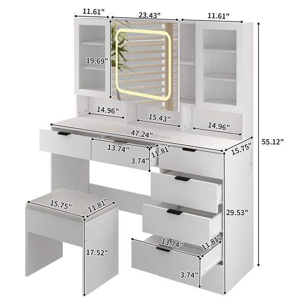 Large LED Lighted Mirror Makeup Vanity Table Set with Charging Station Glass Doors Drawers-for Your Daily Beauty Routine!