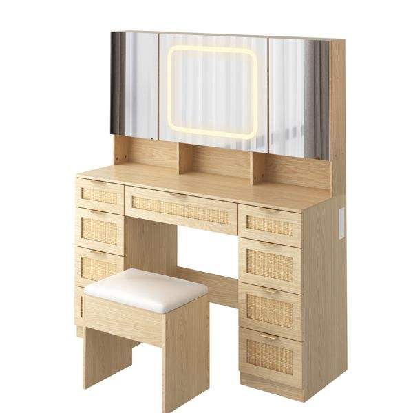 Large Makeup Vanity Table Set with 3 Opening LED-Lit Mirrors Full Storage Behind Mirror D Style Design