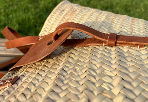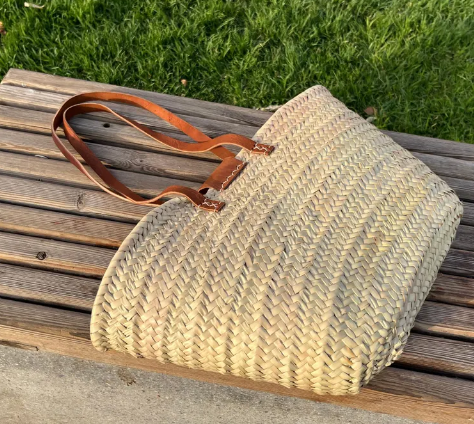 Large Market Basket Handmade Moroccan Straw Bag Leather Handle Woven Tote Sustainable Shopping Bag Boho Style Basket