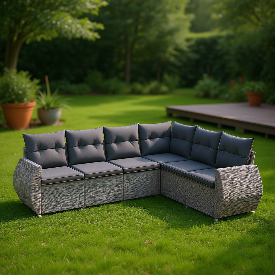 Modular Grey Pe Rattan Garden Sofa Set Steel Frame Outdoor Furniture 6 Seater Contemporary Design
