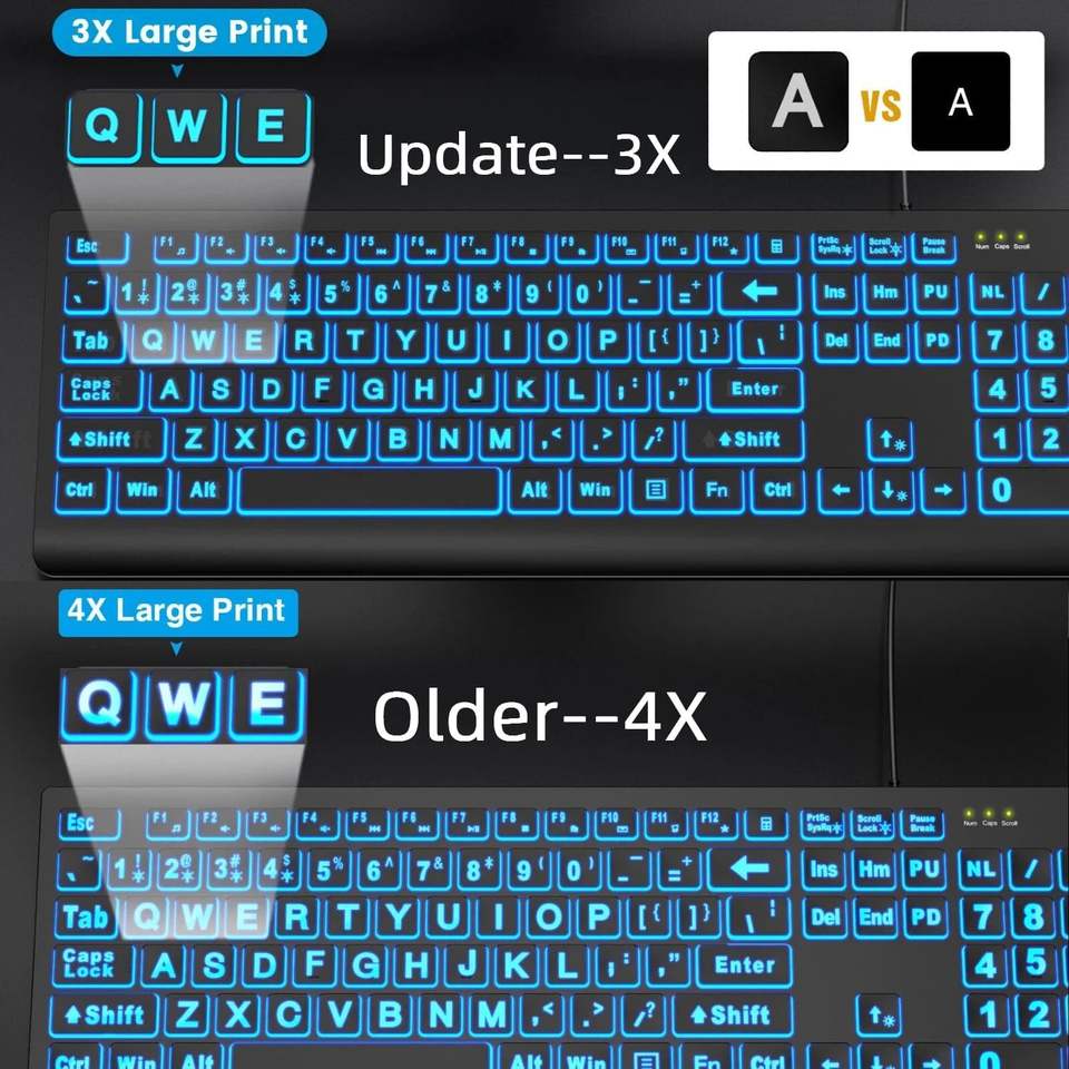 Large Print Backlit Keyboard 7-Color 4 Modes Wired USB Oversize Letters Easy Keys 7-Color 4 Modes Wired USB Oversize Letters