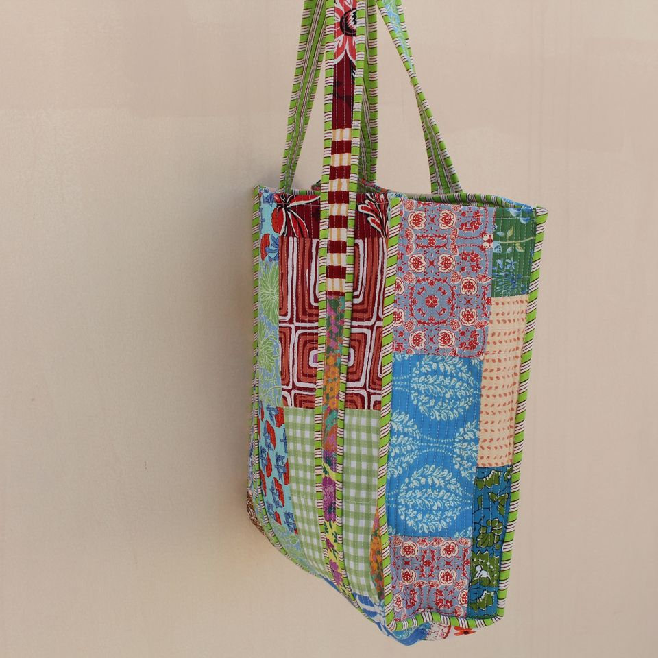 Large Quilted Patchwork 100% Cotton Lightweight Tote Bag with Long Handle for Travel & Shopping