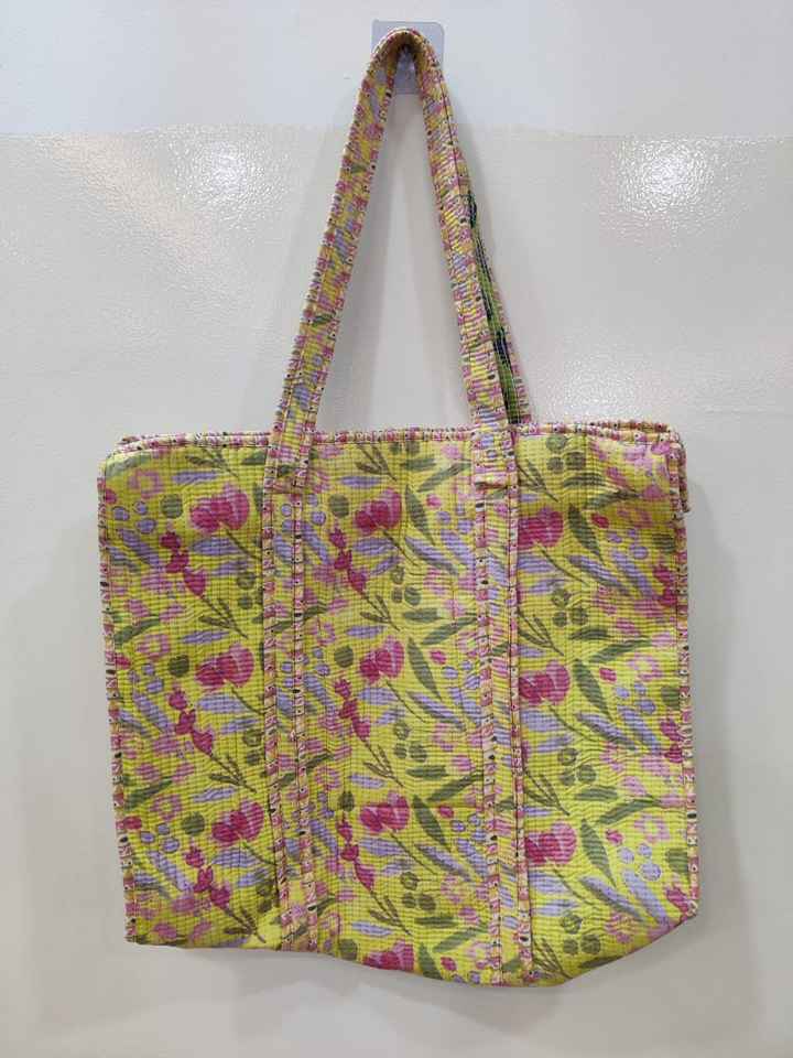 Large Quilted Zipper Tote Bag Traditional Indian Handcrafted Tote Bag with Hand Block Prints Shoulder Shopping Bag with Pockets