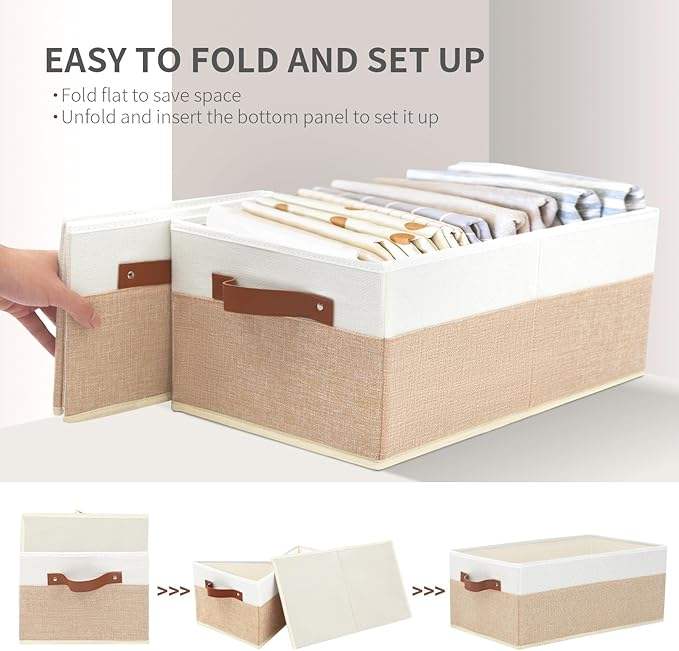 Large Storage Baskets for Shelves, Foldable Closet Organizer with Leather Handles for Clothes, Sheets, Jeans, Toys, Books
