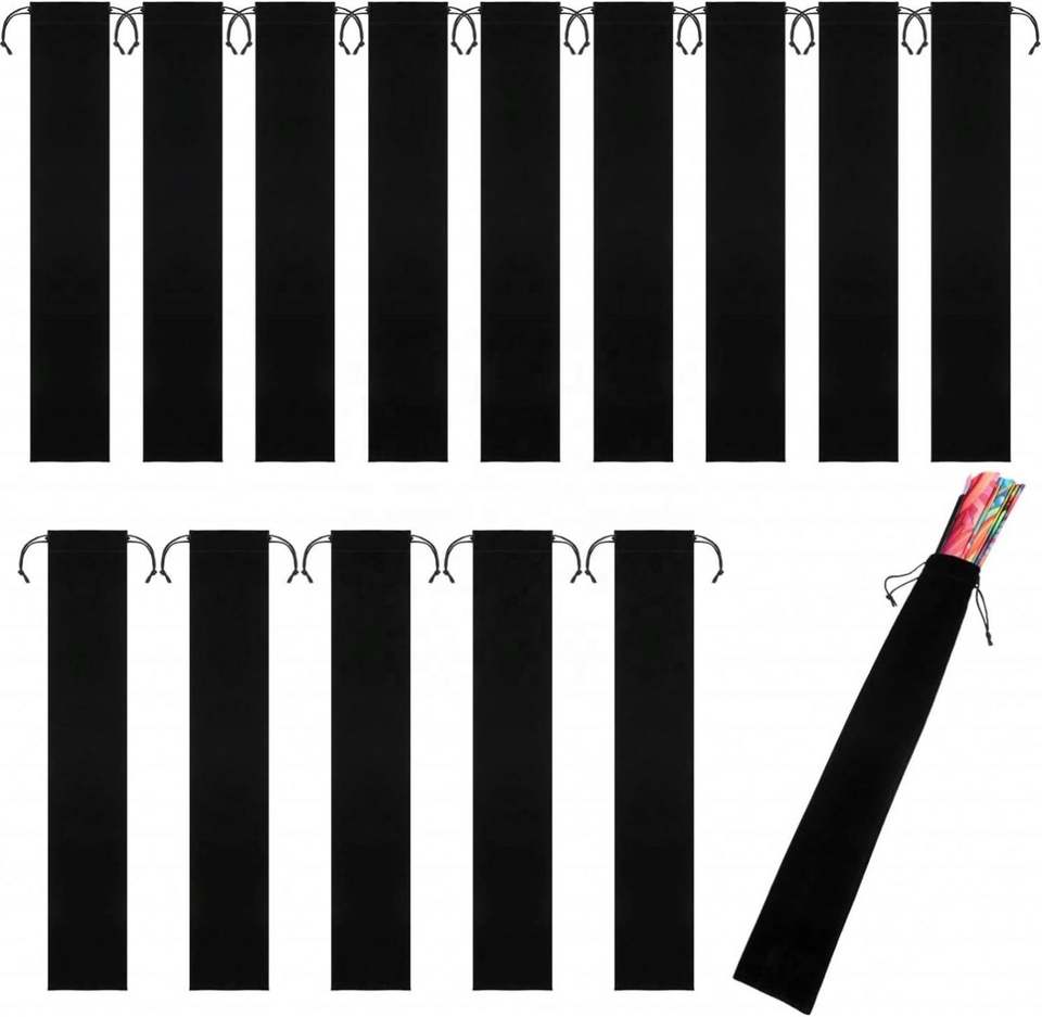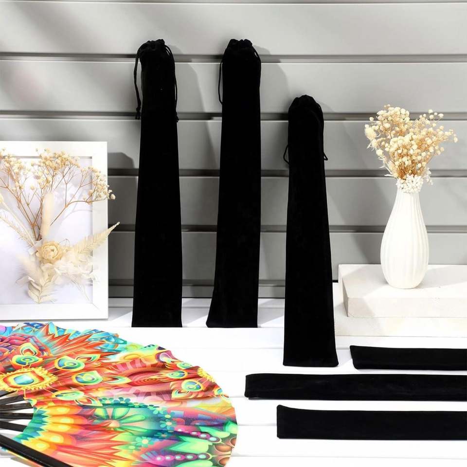 Large Velvet Drawstring Hand Fan Bag 14.57 X 2.76 Inches Black Fabric Sleeve for Folding Hand Fans Protective Gift Wrap Gift