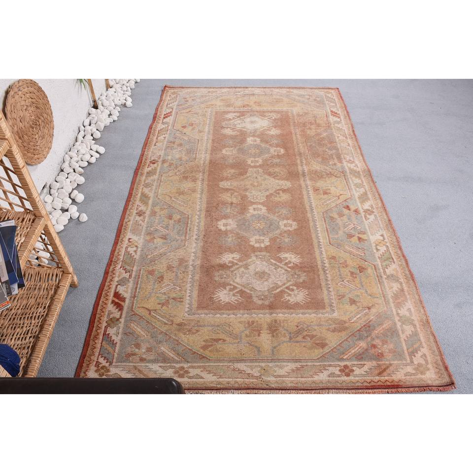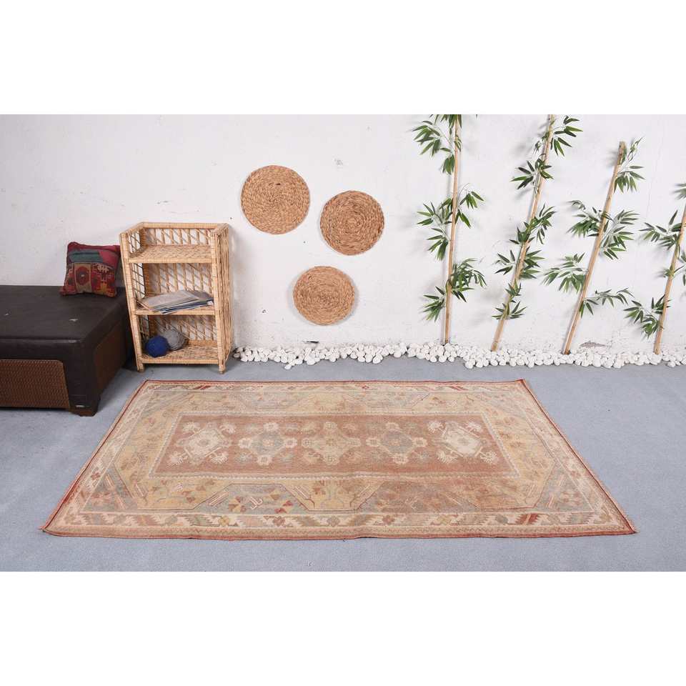 Large Vintage Turkish Wool Rug 4x7ft Brown Orange Patchwork Design Latex Rectangle Abstract Area Set for Hallway Room Decor