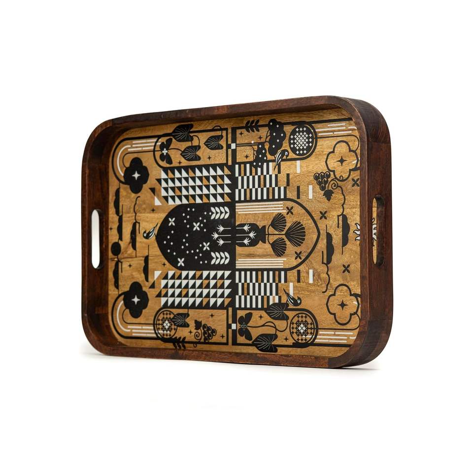 Large Wooden Rectangular Serving Tray For Serving Folk Floral for Home and Kitchen and Dinning Purpose Usage Available for Sell