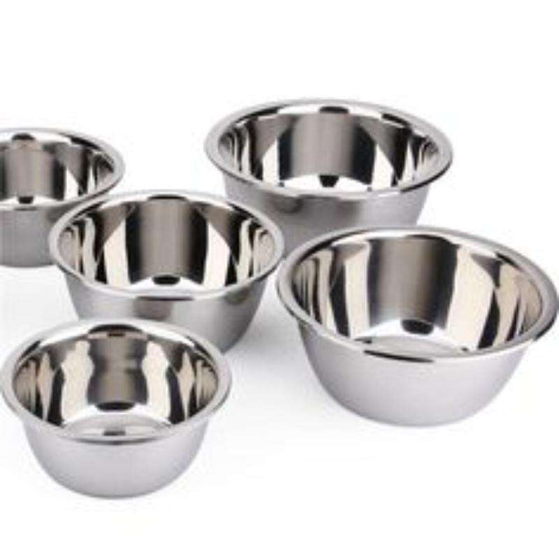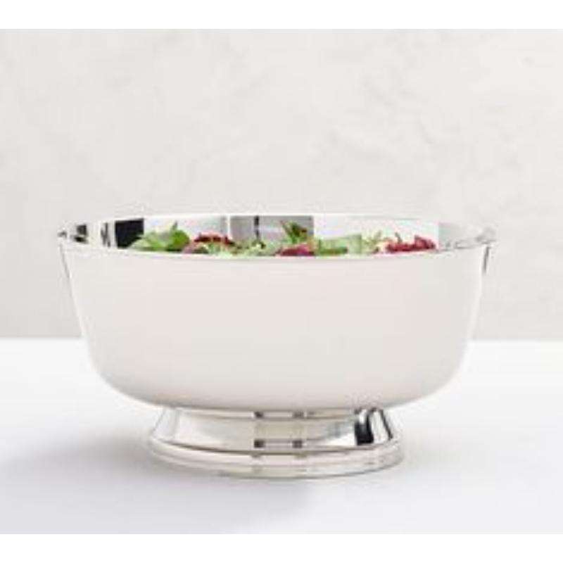 Large stainless steel serving bowl that doubles as a mixing bowl or centerpiece for displaying decorative fruits or flowers