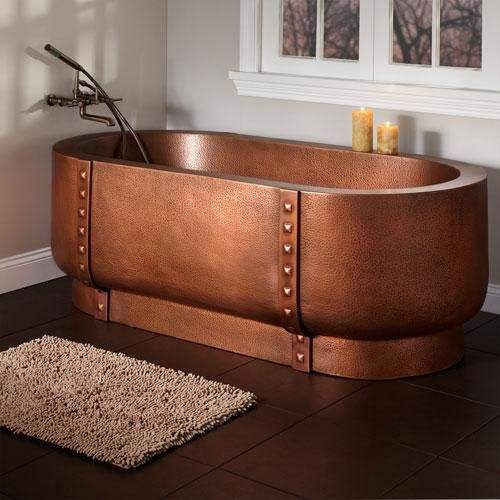 Large vintage copper bath tub for high end bathroom spaces with elegant detailing and warm antique metallic finish