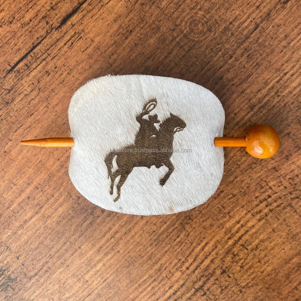 Laser Engraving Cowhide Hair Barrette with Wooden Stick Hair Accessories for Women Girls Genuine Leather Hair Pins Ponytail Clip