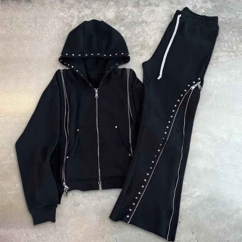Latest 2025 Heavyweight Plus Size Men's Tracksuit Custom Logo Print Acid Wash Zip up Hoodie and Flare Sweatpants Set for Men