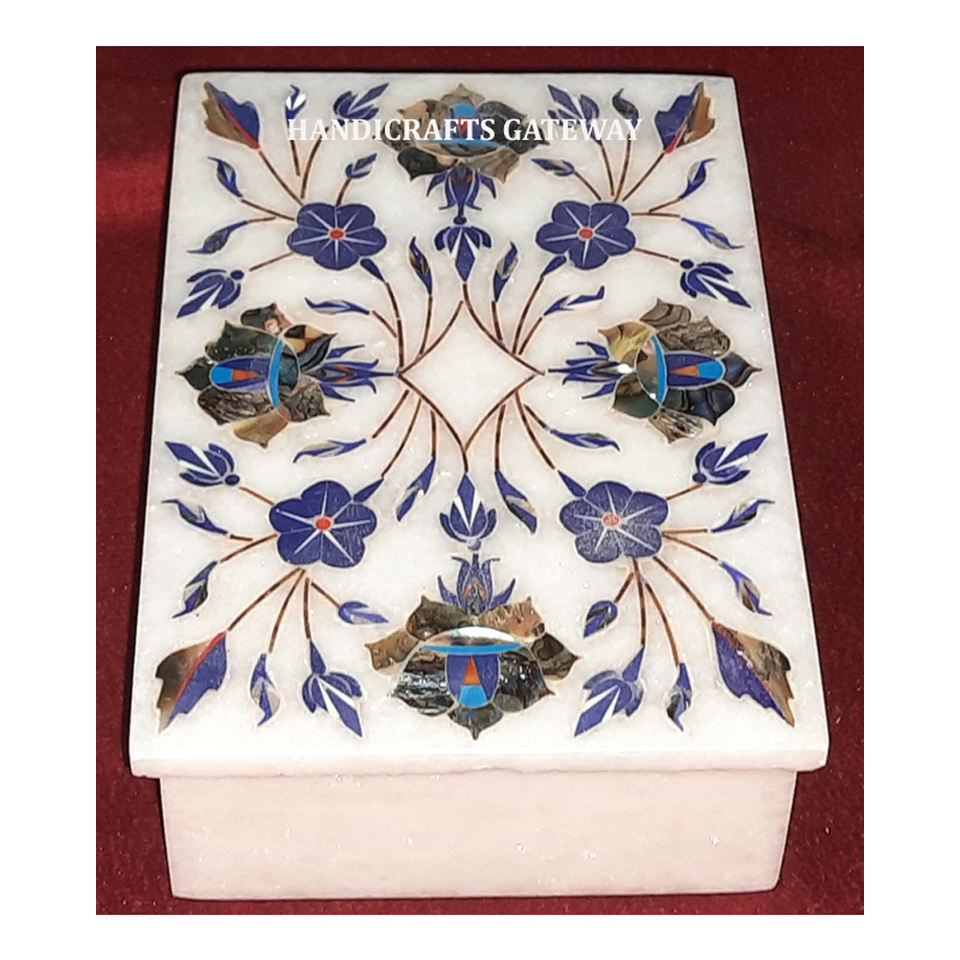 Latest 2025 New Design Latest Product White Marble Natural Blue Inlay Rectangle Shape Jewelry Storage Box In Low Price For Gift