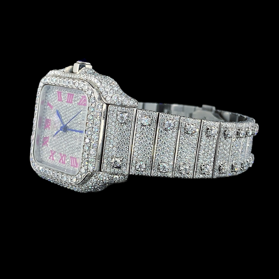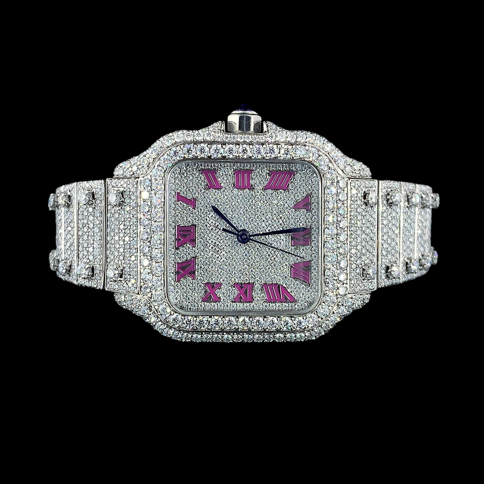 Latest Amazing Iced Out Moissanite Diamond Wrist Watch Hip Hop Style Pink Roman Numerals Man's Wholesale Price Custom Watch