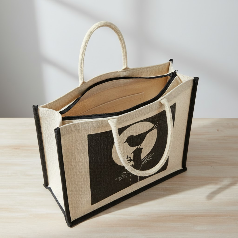 Custom Logo Eco-Friendly Jute Tote Bag Zipper Closure Medium Size Black White Bird Print Reusable Grocery Shopping Promotional