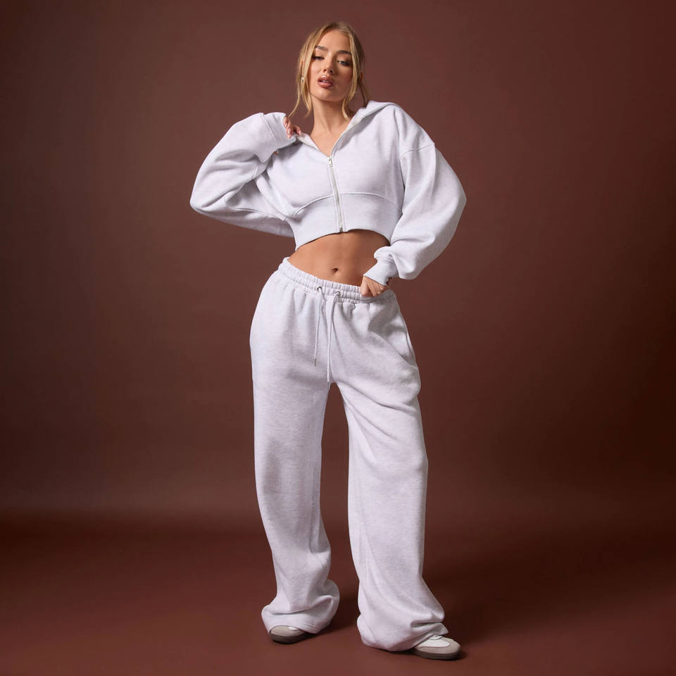 Latest Custom Logo Grey Marl Women's 2 Piece Tracksuit Set Hoodie And Sweatpants Full Length 2 Piece Women's Sweat Suit Set