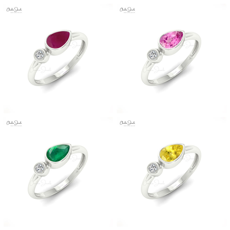 Latest Design 14k Real Gold Diamond Accented Wedding Ring Bezel Set 6x4mm Pear Natural Ruby Two Stone Ring Fine Jewelry Supplier