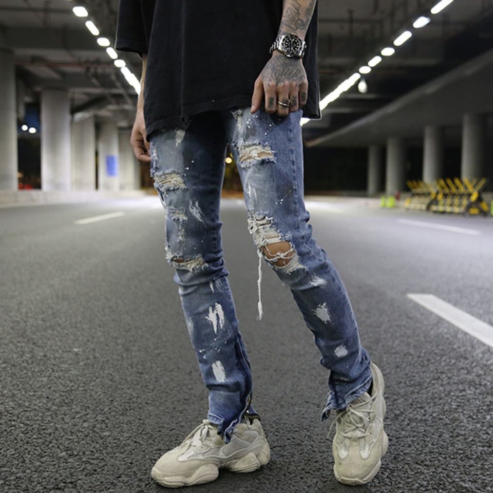 Latest Design Pants Damaged Jeans Blue Ripped Ankle Zipper Skinny Men Jeans Denim Trousers