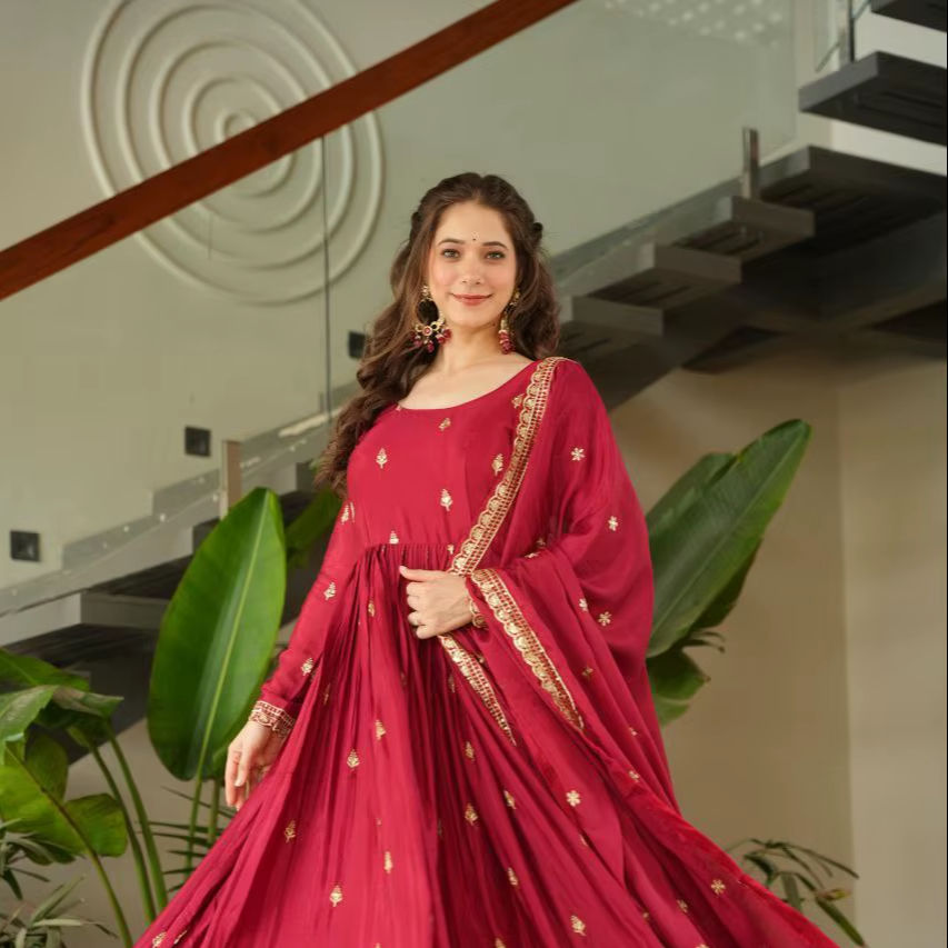 Product Name:Chinon Embroidery Zari Sequence Work Gown With Dupatta