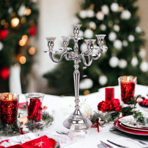 Latest Design Silver Aluminium 5 Arm Candelabra Good Quality Mirror Finished for Weddings Events Tabletop Decoration Metal