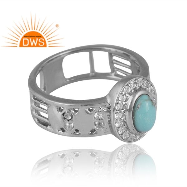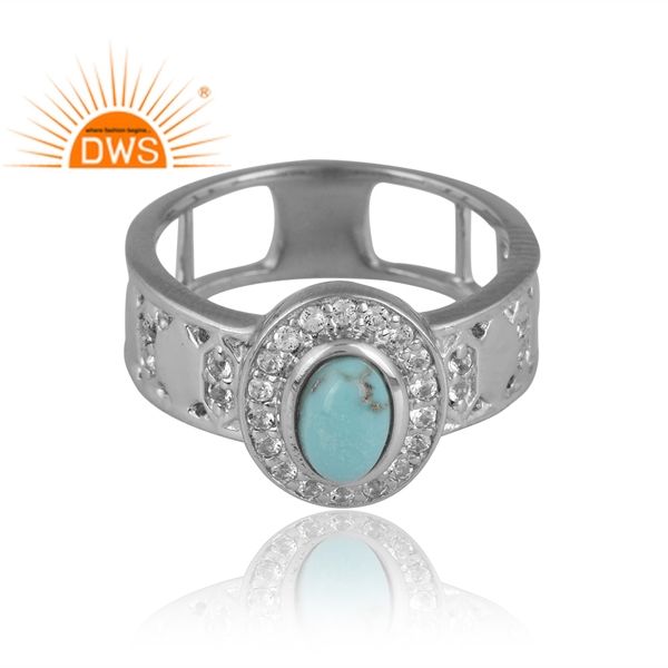 Latest Design Silver Palladium Plated Arizona Turquoise & White Topaz Gemstone Ring For Women Custom Design Jewelry For Women