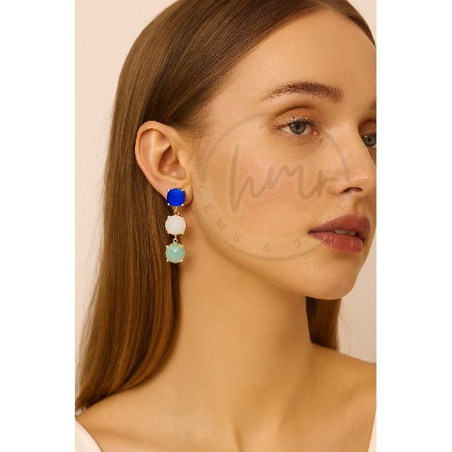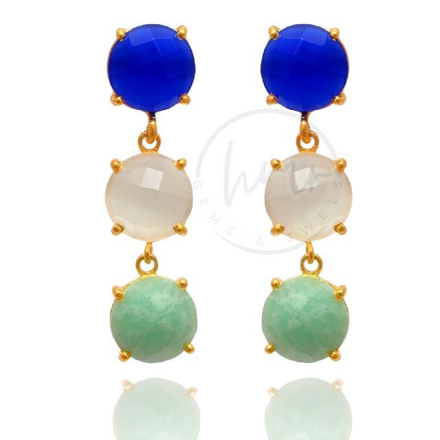 Latest Fashion Designer Triple Gemstone Drop Earrings Brass Gold Plated Blue Chalcedony Rose Quartz Amazonite Dangle Earrings