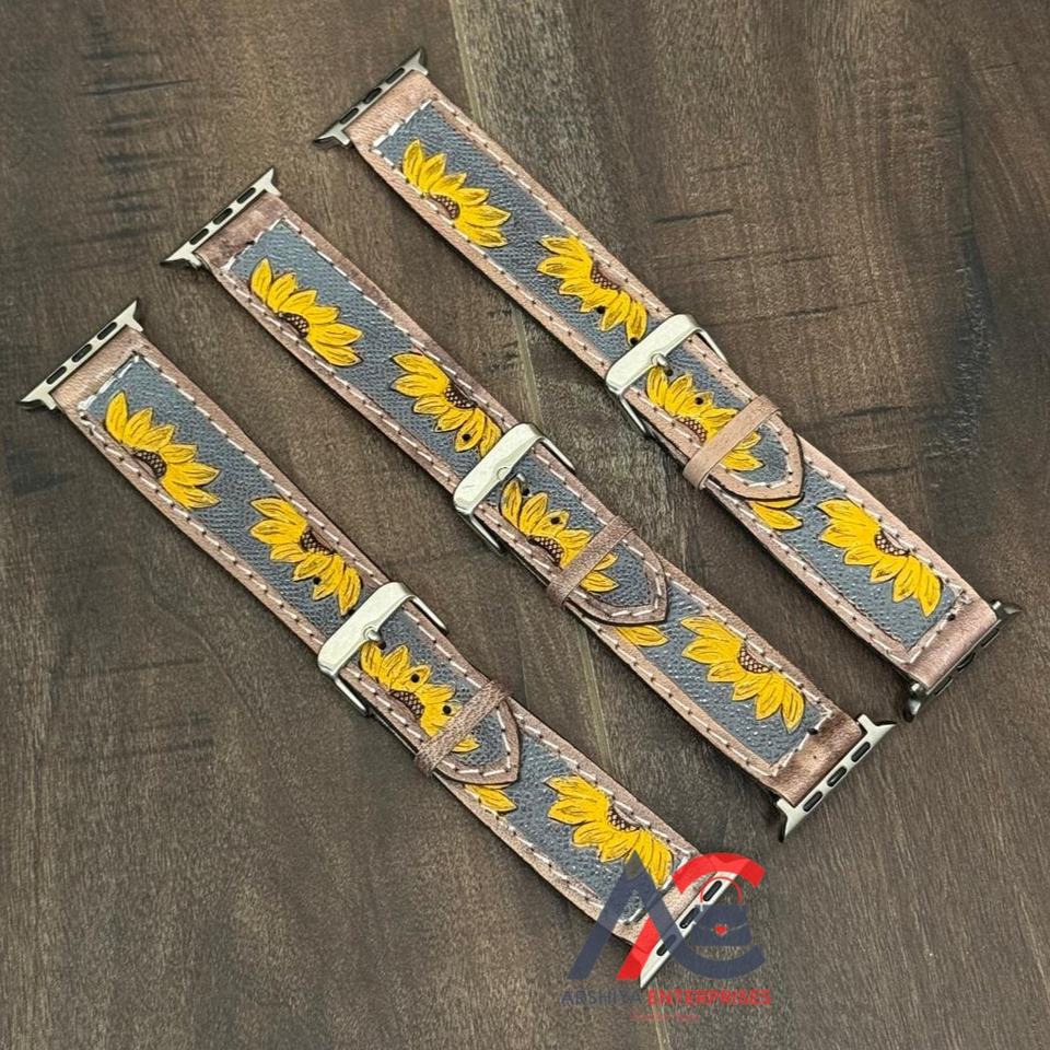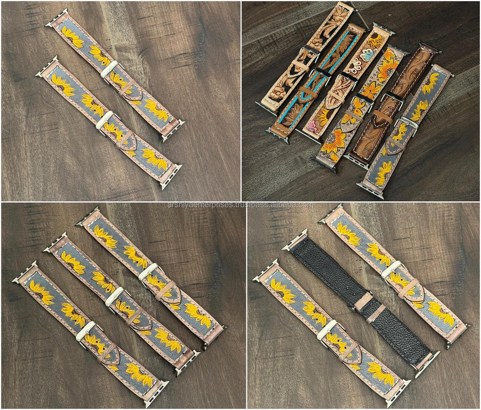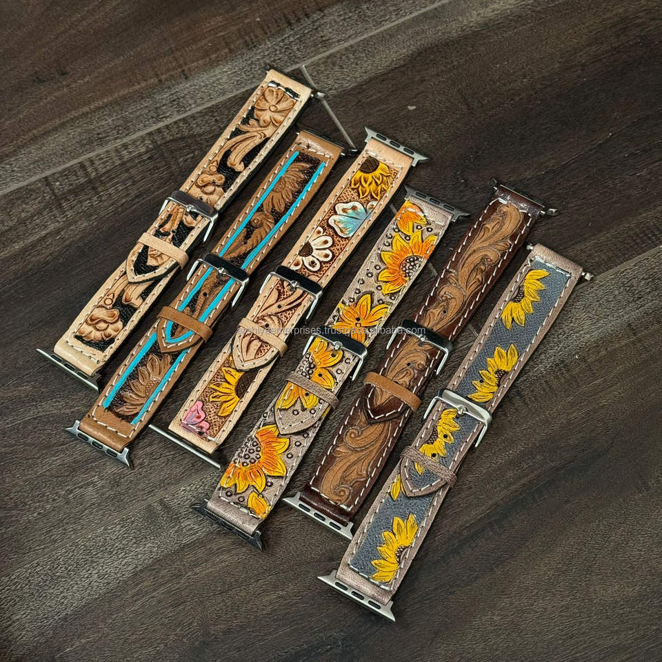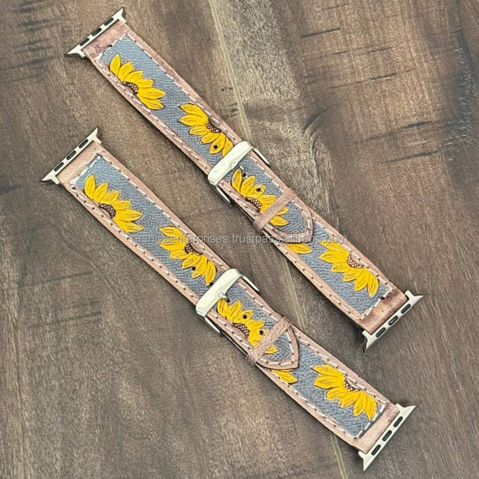 Latest Floral Design Hand Tooled Leather Watch Strap Hand-Stitched Genuine Leather Smart Band Durable Watch Wristband for Unisex