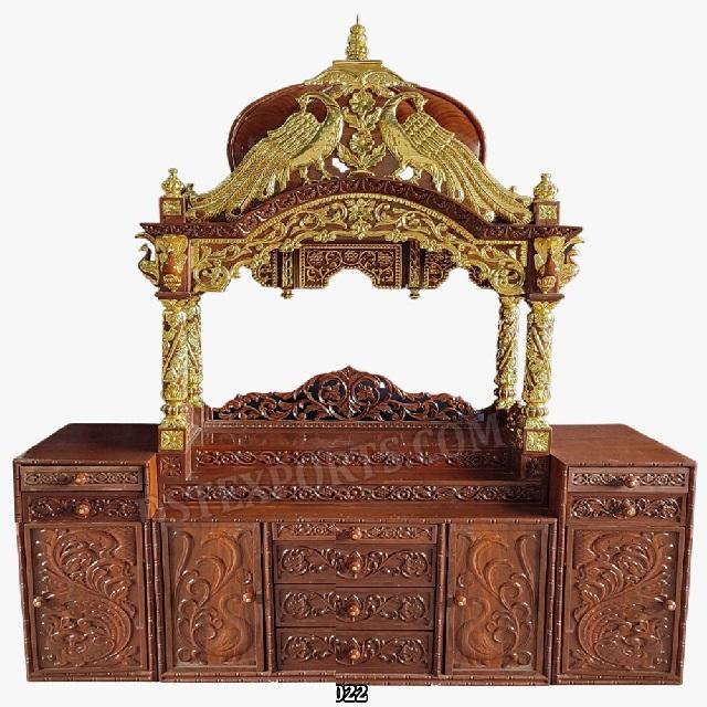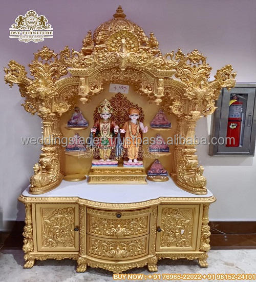 Latest Glossy Gold Peacock Style Temple Large Size Wooden Mandir With Cabinet Beautiful Teak Wood Temple for Sale Kenya France