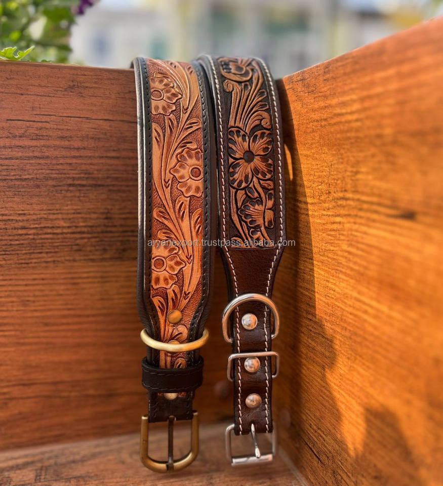 Latest Hot Selling Floral Hand Tooled Leather Dog Collar for Pets Real Genuine Leather Padded Adjustable Accessory for Neck Belt