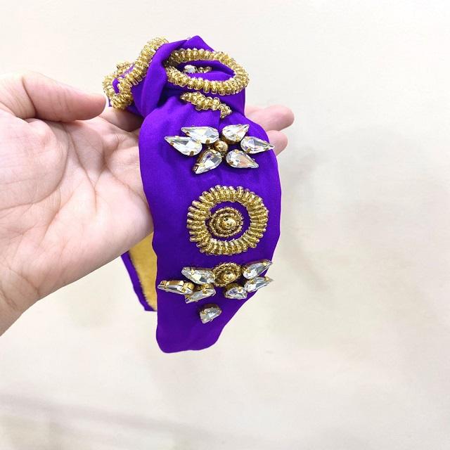 Latest Indian Hand Embroidered Floral Crystal Beaded Headband Purple Knotted Mardi Gras Hair Accessory