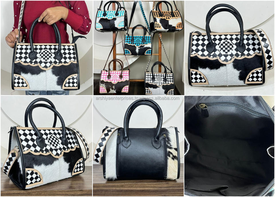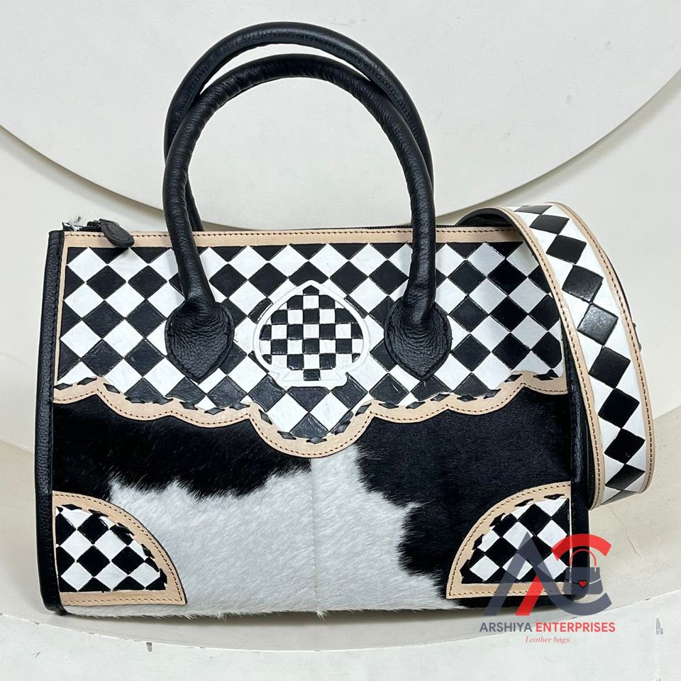 Latest Manufacturer Black & White Checkered Genuine Tooled Leather Shoulder Purse Concealed Carry Crossbody Tote Bag for Women's