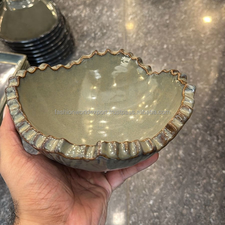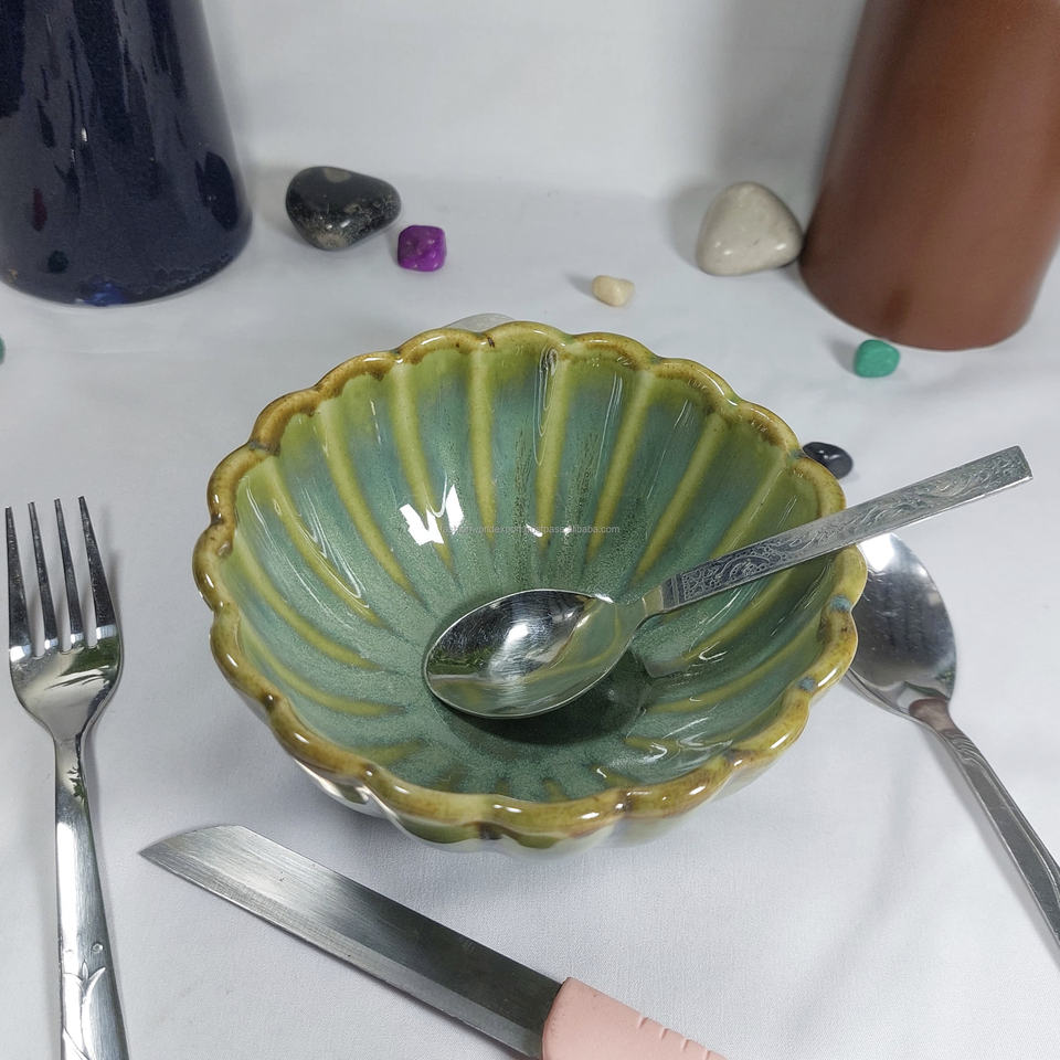 Latest Moss Green Pottery Bowl with Sculpted Bolt Accents Unique Artisan Ceramic Dish for Snack or Decorative Use in Kitchens