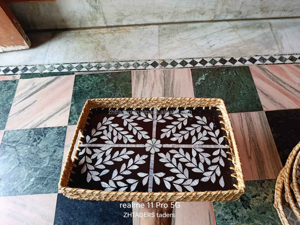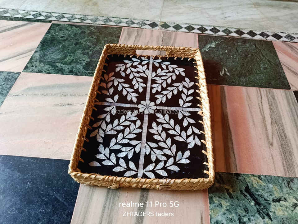 Premium Quality Round Rattan Tray with Mother of Pearl Inlay Artistic Design Perfect for Serving and Gifting from India