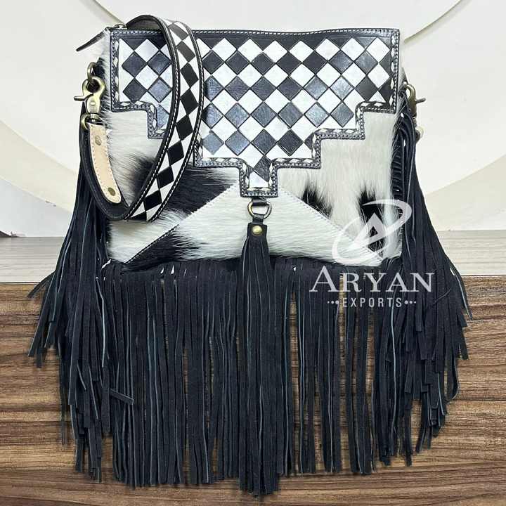 Product Name:Hand Tooled Cowhide Leather Checkered Design Fringe Handbag