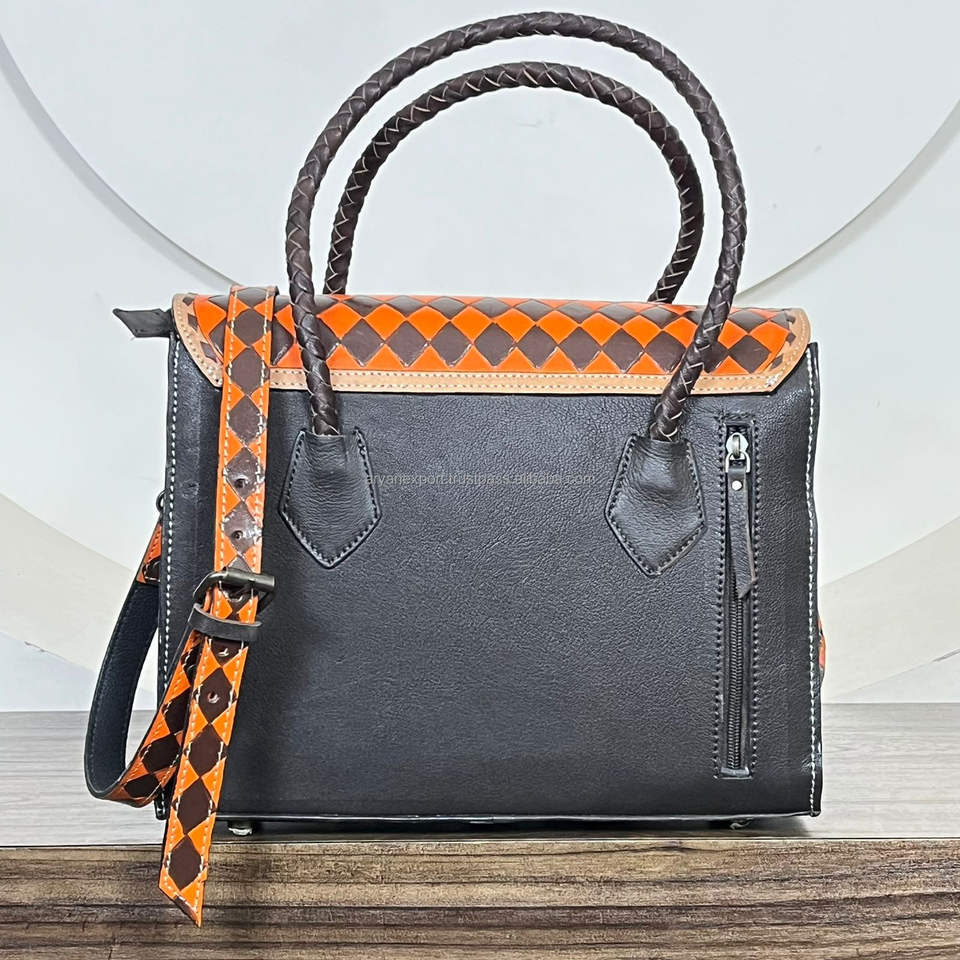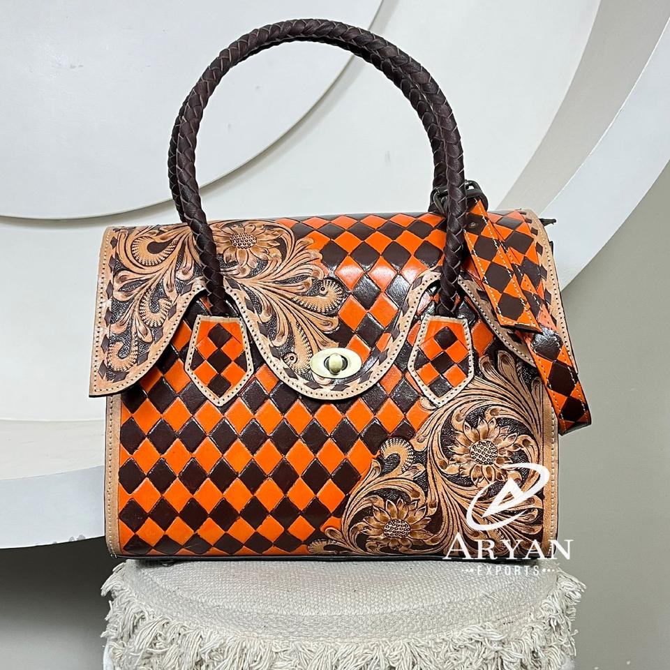 Latest Wholesale Hand Tooled Cowhide Leather Tote Bag with Checkered Pattern Braided Handle Detachable Crossbody Shoulder Strap