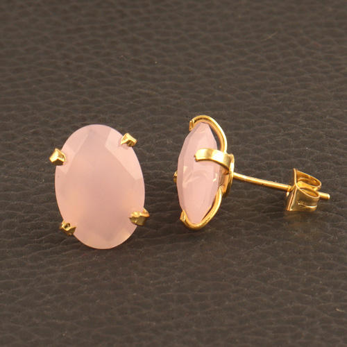 Latest Trendy Ladies Fashion Earring Oval Faceted pink Chalcedony Stud Earring 24k Gold Plated Claw Set Handmade Earring Jewelry