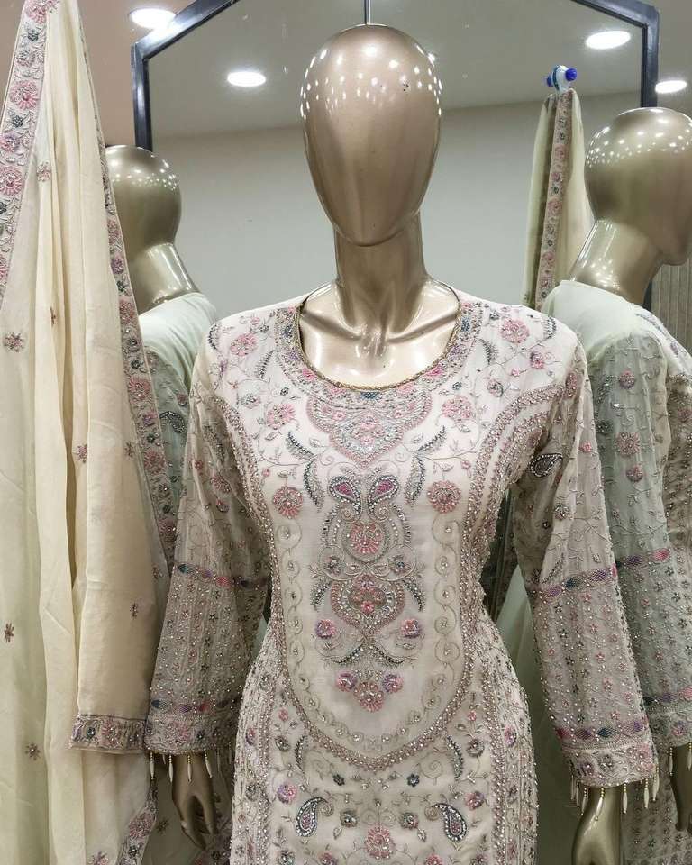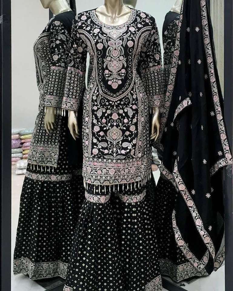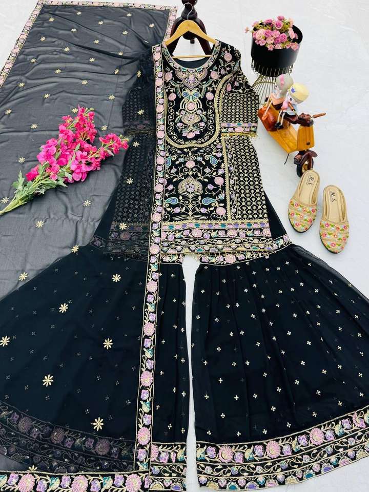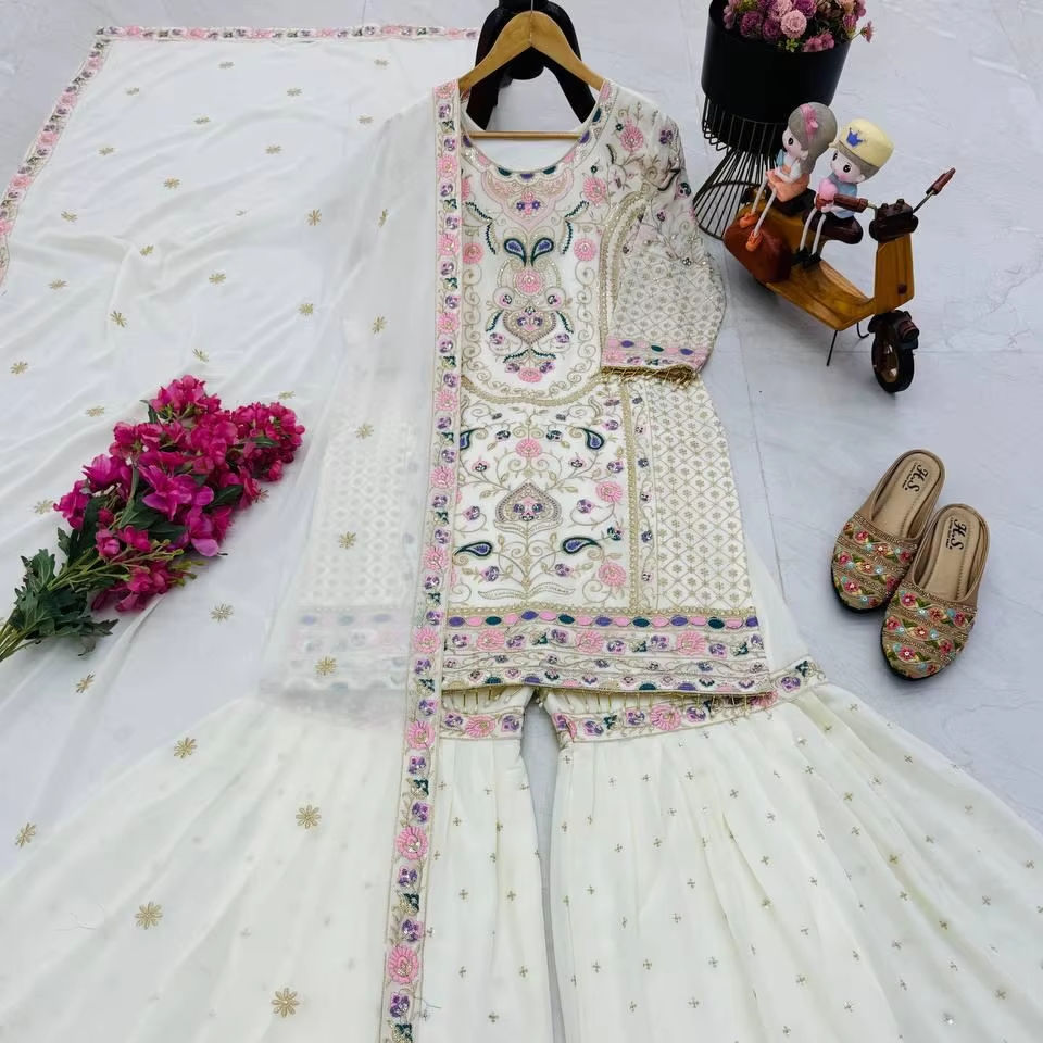 Product Name:Faux Georgette Sequence Embroidered Top Palazzo And Dupatta
