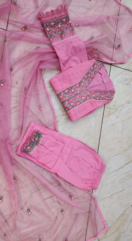 Product Name:Cotton Embroidery Kurta With V-Neck Pant And Dupatta