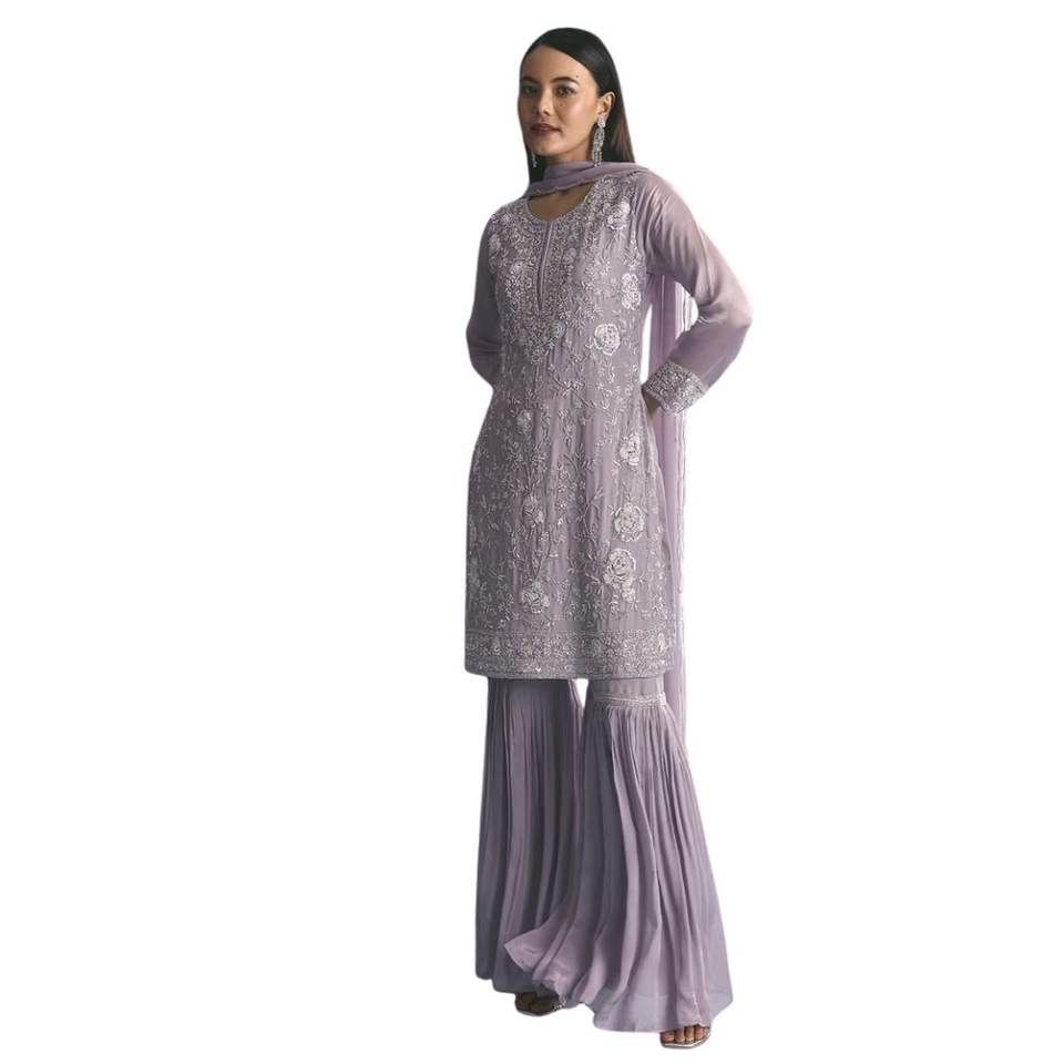 Lavender Chinon Kurta Sharara Suit with Moti Embroidery for Elegant Indian Wedding Party and Traditional Festive Outfit