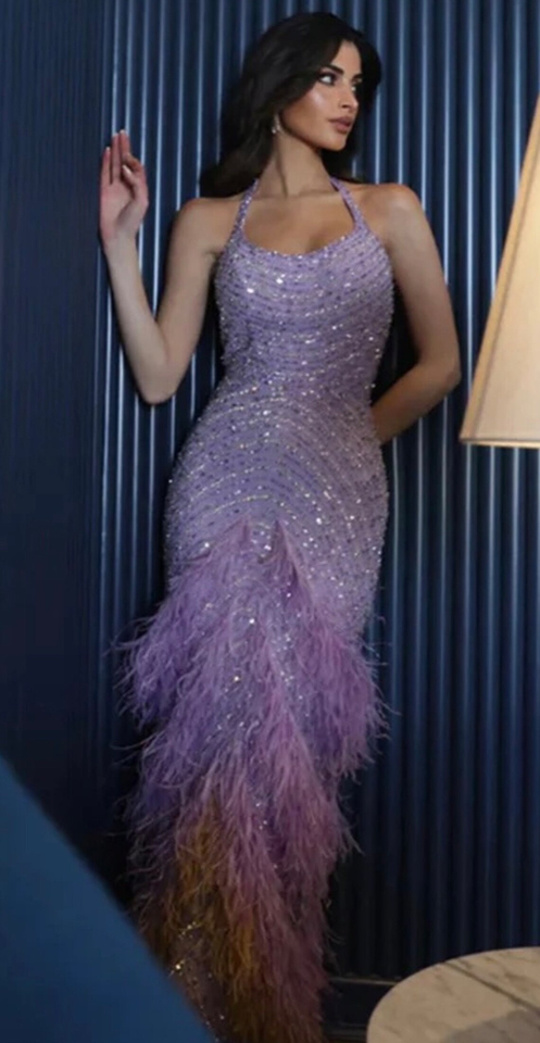 White Modern Crystal Beaded Floor-Length Wedding Dress with Multi Color Feather Trim Anti-Static