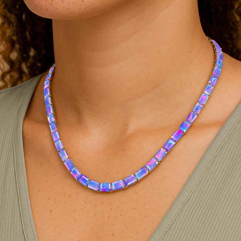 Lavender Opal Octagon Gemstone Tennis Necklace Fire Lavender Opal 925 Sterling Silver 14k Gold Plated Delicate Gift