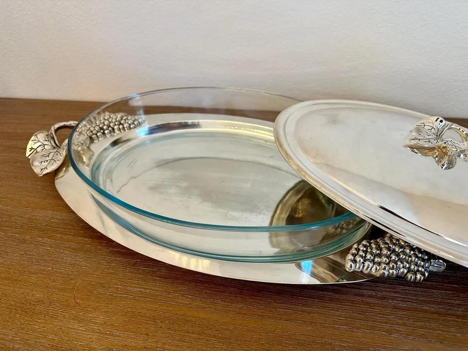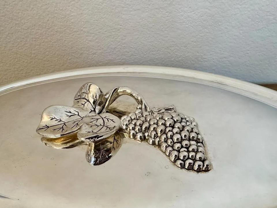 Lavish Style Silver Oval Casserole with Grape Design Handle for Hot Food Serving Dining Table Display and Festive Hosting