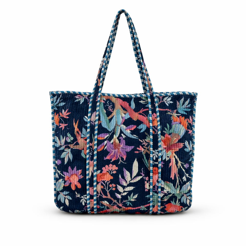 Le Souvenirs Blue Velvet Reversible All Seasons Vintage Bohemian Lightweight Shopping Travel Bag Inner Pockets Canvas Lining