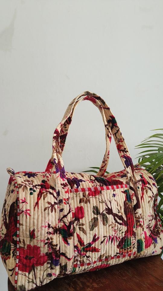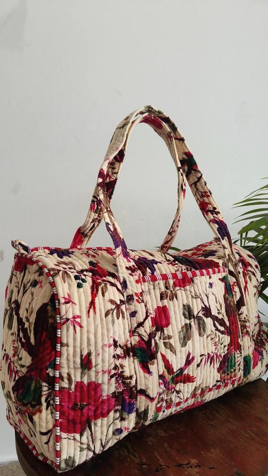 Le Souvenirs Handmade Quilted Velvet Duffle Bag Red Floral Print Handprint Yoga Design Eco-Friendly Sustainable Sport Large