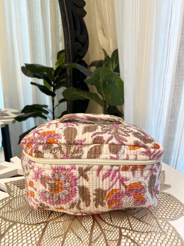 Le Souvenirs Quilted Cotton Makeup Storage Case Zipper Closure Vintage Style Water Resistant Eco-Friendly Warm Florals Design