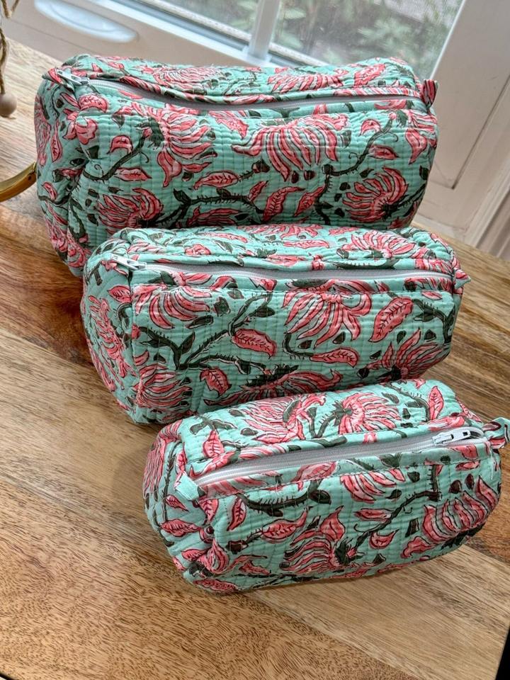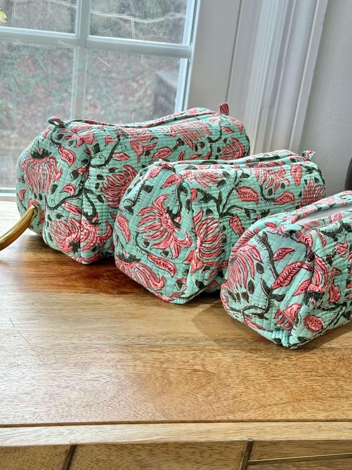 Le Souvenirs Vintage Hand Block Print Cotton Cosmetic Bags Set Zipper Closure-Durable Water Resistant Eco-Friendly Large Travel
