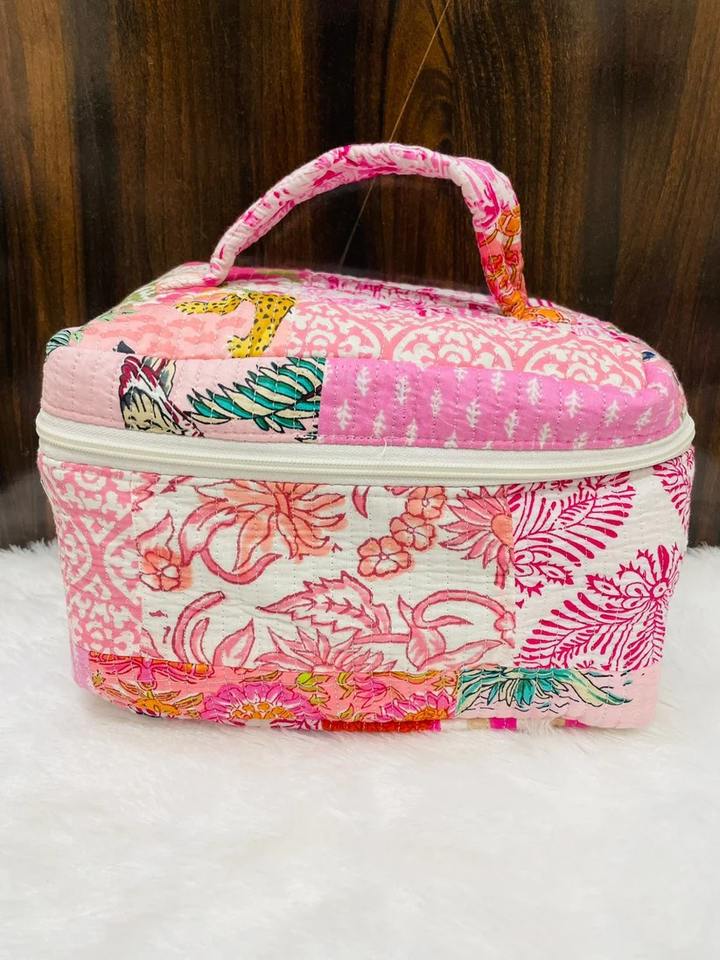 Le Souvenirs Vintage Quilted Cotton Handblock Vanity Pouch Zipper Closure Inner Pockets Durable Water Resistant Makeup Storage